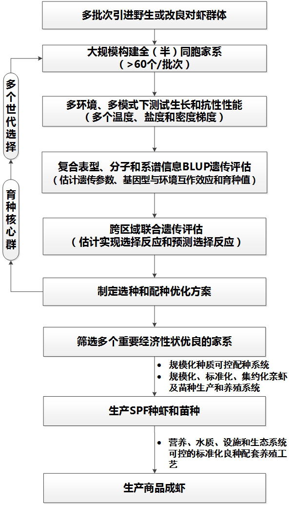 承担省十三五(农业)水产新品种南美白对虾选育重大专项。与中国水产科学院黄海水产研究所开展育种协作攻关,采用家系选育和群体选育相结合的方法,结合BLUP法评估和分子标记辅助育种技术等手段,开展南美白对虾高产、抗逆新品种的选育,育种目标是自主培育适合浙江当地环境的南美白对虾低盐速生新品种。